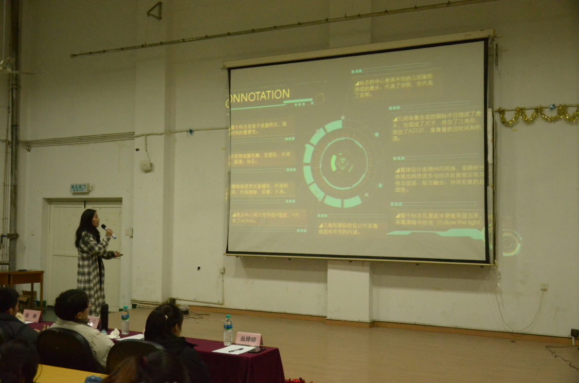 比赛开始前,大学生记者团志愿者绘制了宣传海报并张贴于义丰楼一楼大厅,全体志愿者也进行了下班宣传,以确保活动的顺利进行。各班积极踊跃报名,提交作品。评委通过初赛评审六个优秀班级进入决赛,评选结果于义丰楼一楼大厅张贴公示。在决赛中,各班的班长或同学代以PPT的形式向在场观众介绍了本班的班徽设计图纸,并讲解了构思过程、寓意等内容。评委根据各班的班徽设计理念、PPT制作及讲解表现进行了现场评审评分,并由院办公室的志愿者现场统计分数。接着,院办公室和大学生记者团志愿者带来了精彩的表演,现场气氛高涨,在场观众激情四射。最后,A2124班摘得桂冠,陈曦老师为其颁奖,并合影留念。
