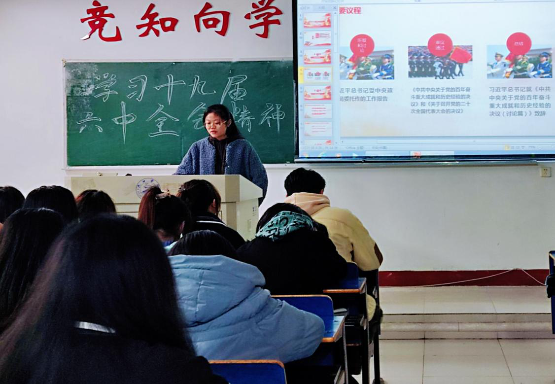 活动伊始,主讲人讲述了十九届六中全会的基本概况,强调了在生活、学习中贯彻十九届六中全会精神的重要性。接着,结合历史经验,分析了中国在政治、经济、文化等方面的发展历程。最后呼吁同学们要以史为鉴,坚持走中国特色社会主义道路,树立好共产主义远大理想,实现自身发展。