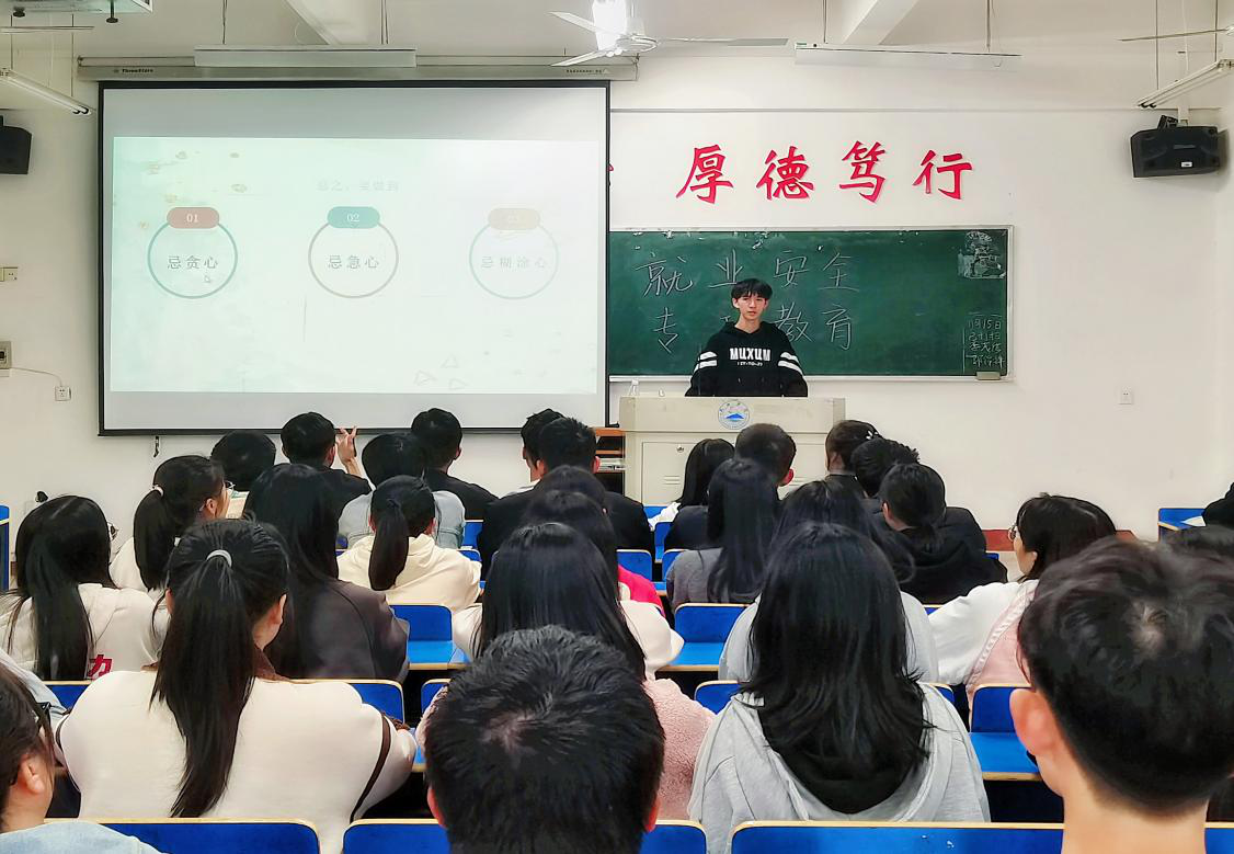 会上,各班团支书以当代大学生的求职现状为话题,分析了求职受骗的原因,强调了求职安全的重要性。接着,结合ppt的内容和视频,讲解了几种常见的求职陷阱.最后,向同学们呼吁要理性思考,理智选择,做到三个须知:1.不可随意交付身份证;2.不可随意泄露个人信息;3.不可随意出示银行卡卡号和密码。