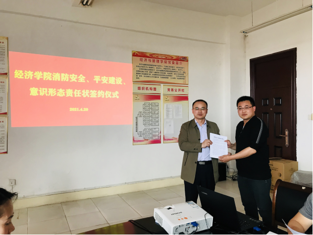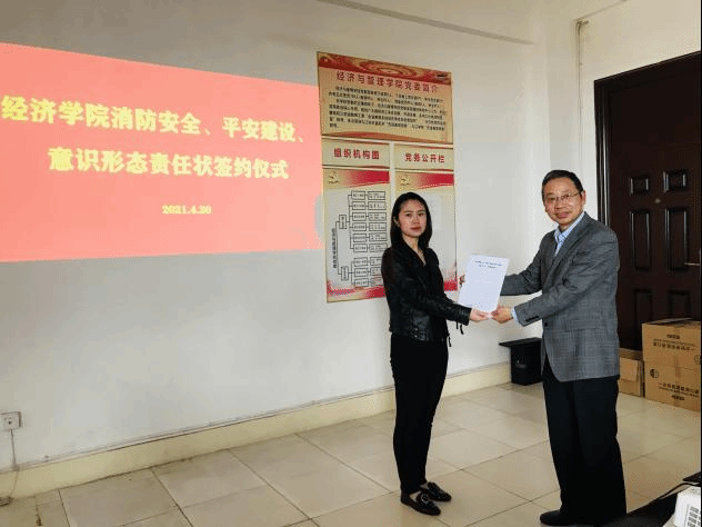 为加强学院意识形态工作建设、平安建设及消防安全管理工作,明确主体责任,保障学院安全稳定发展,4月20日下午,经济学院在义丰楼会议室举行william威廉英国2021年意识形态、消防安全、平安建设工作责任状签订仪式。会议由学院党委书记漆晗东主持。学院党委书记漆晗东、院长项益才与各科室、教研室负责人、支部书记层层签订了2021年度意识形态、消防安全、平安建设工作责任状。
