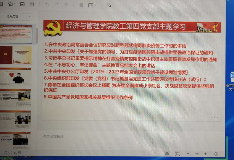 按照经管学院党委部署要求,3月18日,经管学院教工第四党支部党员在家召开腾讯视频会议,学习习近平总书记近期疫情防控重要讲话精神,《2019—2023年全国党政领导班子建设规划纲要》、《党委(党组)书记抓基层党建工作述职评议考核办法(试行)》、《中国共产党党和国家机关基层组织工作条例 》。此次会议由林敬松同志主持,教工四支部党员参加了此次网络视频会议。