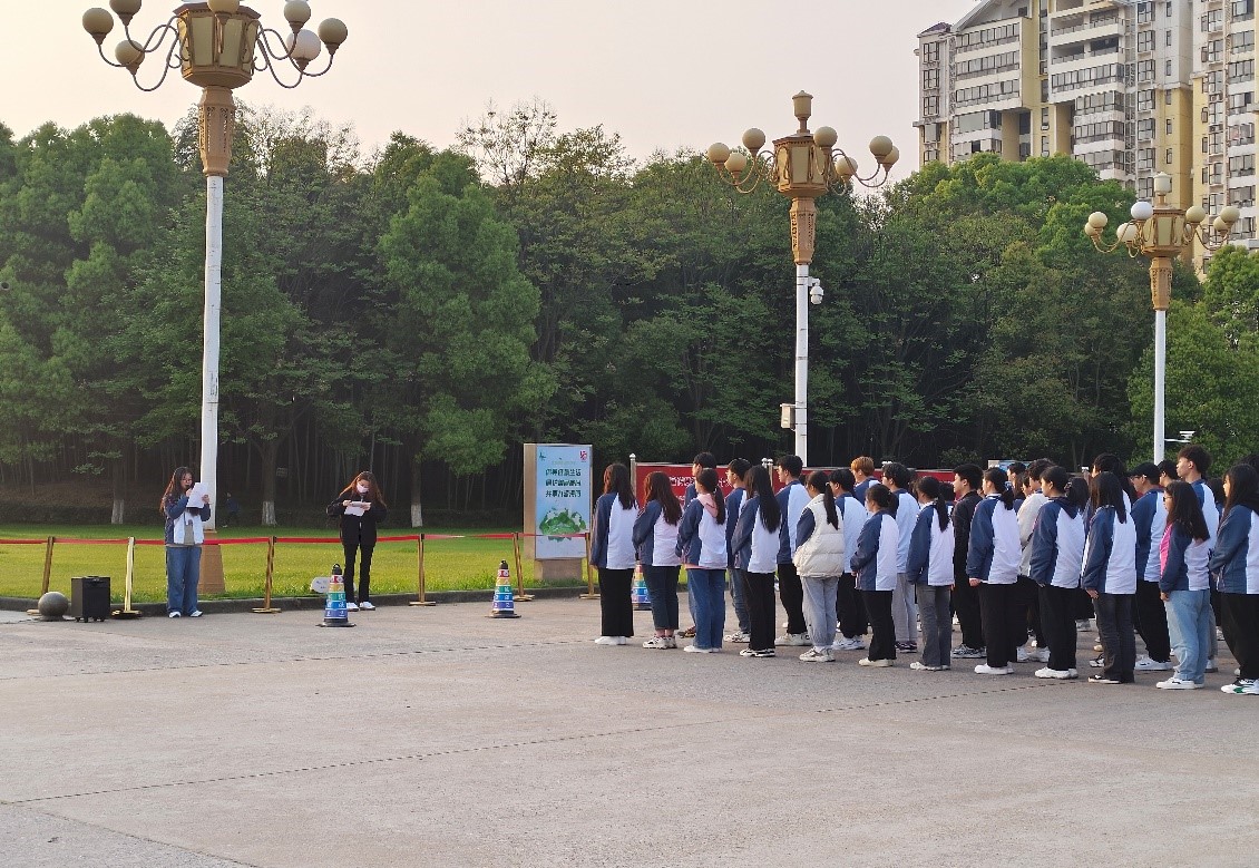 晨光熹微,全体学生准时来到西门广场前列队集合,昂首挺胸,肃穆而立,静待庄严时刻的到来。上午6时30分,随着军靴声、口号声由远及近,英姿挺拔的国旗护卫队护卫着鲜艳的五星红旗,迈着整齐划一、铿锵有力的步伐入场,升旗仪式正式开始。彤彤旭日,熠熠朝霞,伴随着雄壮激昂的《义勇军进行曲》,五星红旗冉冉升起,随风飘扬,全体学生高唱国歌,行注目礼。