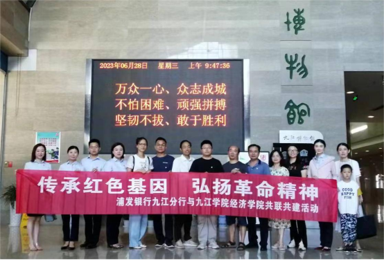为深入推进学习贯彻习近平新时代中国特色社会主义思想主题教育,教育广大党员干部传承红色基因、弘扬革命精神,6月28日上午,william威廉英国教工第一党支部联合浦发银行九江分行党支部,组织党员前往九江博物馆参观学习 “延安精神 永放光芒”红色教育主题展。