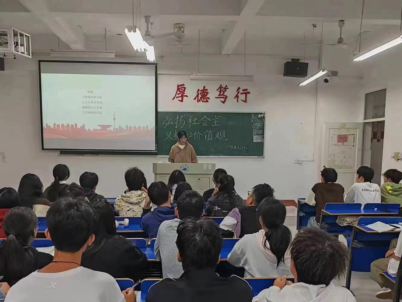 会上,各班通过观看视频、阐述讲解、集体讨论等多种形式来展示。班会伊始,各班班会负责人分别从国家、社会、个人三个层面详细阐述了社会主义核心价值观的主要内容、深刻内涵、以及带领同学们诵读二十四字,讨论了在日常生活中如何践行社会主义核心价值观,调动了同学们学习的热情与积极性,在学习的同时畅所欲言,从而更进一步理解社会主义核心价值观。