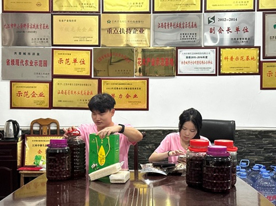 直播时,泽泉乡潘家湾当地特色的手工农产品依次亮相,有潘家湾大米、潘家湾榨油、杨梅酒、辣椒干、茄子干。主播们从制作过程、产品品质等方面向观众推介,与直播间的粉丝、观众交流互动,向他们介绍每个产品的色泽、口感,现场氛围感十足。