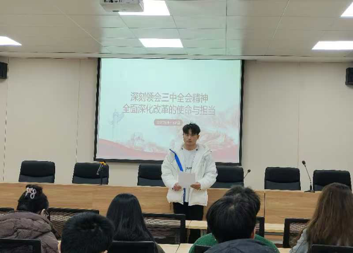 宣讲会上,通过集中观看党的二十届三中全会相关视频、主讲人领读全会精神相关材料以及现场交流等形式,让同学们对全会精神有了更深入的理解。宣讲团成员高子奇、熊磊、胡雪晴依次登台发表演讲,并带领同学们认真学习全会要点,引导青年学子坚持以习近平新时代中国特色社会主义思想为指导,深刻认识全面深化改革的重大意义和使命担当,鼓励同学们脚踏实地,踔厉奋发,积极投身于新时代中国特色社会主义的伟大实践,为祖国的发展贡献自己的力量。同学们纷纷表示,将坚定不移以习近平新时代中国特色社会主义思想为指导,深入贯彻党的二十届三中全会精神,把全面深化改革的使命担当融入到学习和生活当中,努力争做有理想、敢担当、能吃苦、肯奋斗的新时代好青年,以实际行动为实现中华民族伟大复兴的中国梦贡献青春智慧和力量。