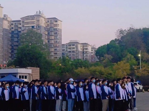 早上六点半,升旗仪式准时举行。仪式伊始,国旗班的旗手们迈着整齐的步伐护送国旗至旗杆下。伴随着庄严的《义勇军进行曲》,五星红旗冉冉升起,在空中随风飘扬。在场人员全体肃立,面向国旗行注目礼。