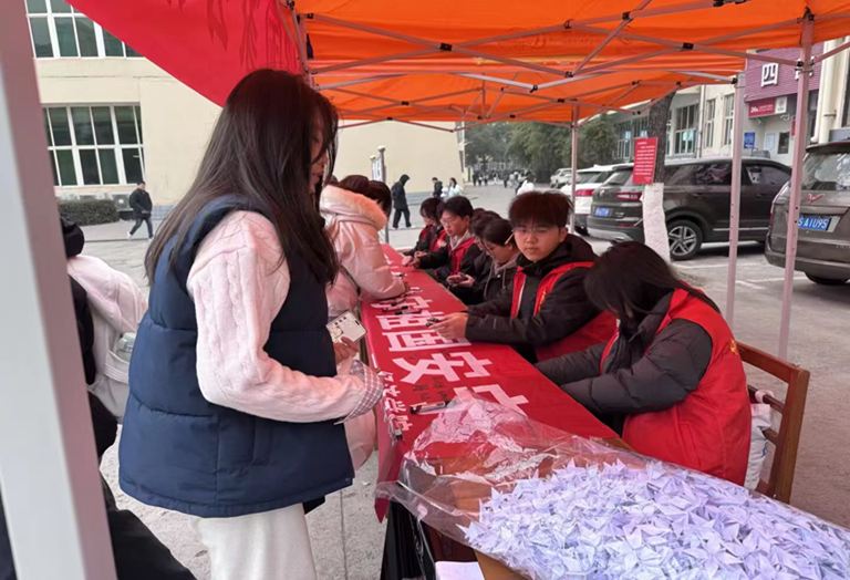 现场的同学有序驻足:有人在红底横幅上签下姓名,笔锋里裹着郑重;有人将“勿忘国殇,吾辈当强”的便签贴向展板,字迹晕开温软的敬意;还有人轻捏小白花,仔细粘向“12·13”形状的告示牌——每朵花的落点,都是一次与历史的轻声对话。当人群聚拢,举起“永怀国殇之痛 共守祖国安宁”的横幅合影时,年轻的脸庞上,敬畏与坚定交织成最动人的神情。