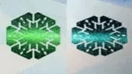 (2)光彩光变图案:位于票面背面下方,改变观察角度,“雪花”图案的颜色在绿色和蓝色之间变化,并可见一条亮光带上下滚动。